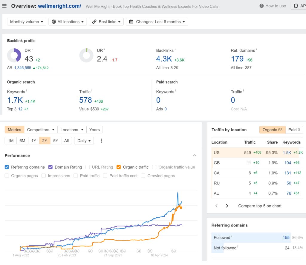 Wellmeright, an online directory for wellness and health experts offering their services, approached us with two very clear goals. The website wanted to increase its direct, relevant organic traffic and improve its domain authority.